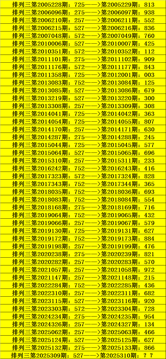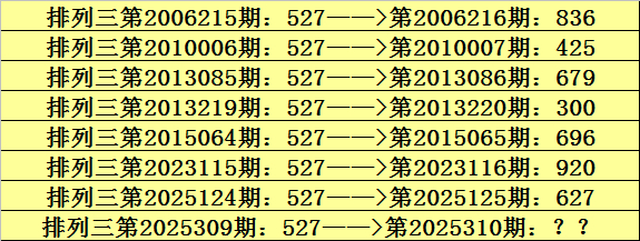 第2025309期排列三奖号为527,历史上该号码直选出现8次,下期奖号分别为:836、425、679、300、696、920、627。