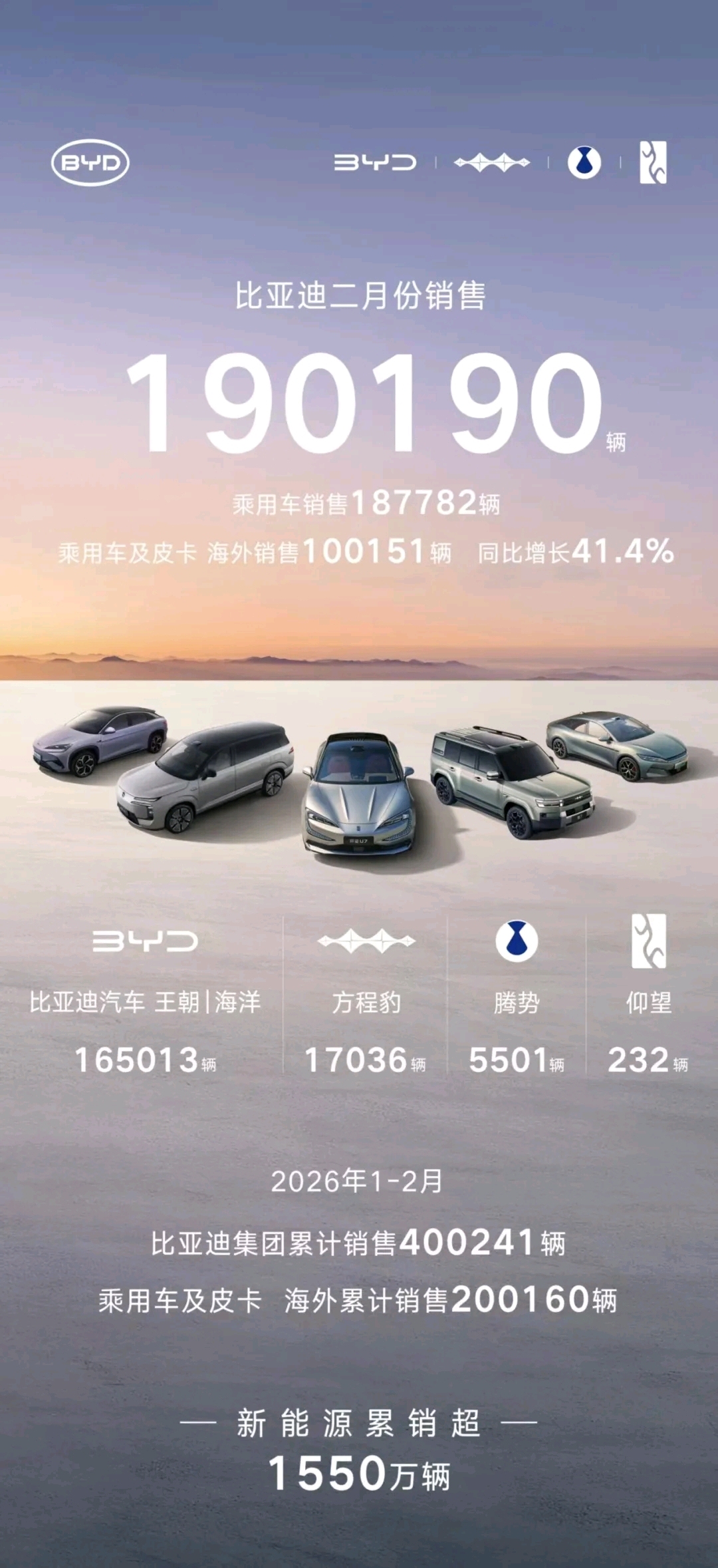 数据显示,比亚迪2月销售190190辆,其中比亚迪汽车(王朝/海洋)销量为165013辆、方程豹17036辆、腾势5501辆、仰望232辆,相比1月下跌幅度在19%左右。今年1-2月比亚迪集团累计销售400241辆。截至2月,比亚迪新能源累计销售超1550万辆。