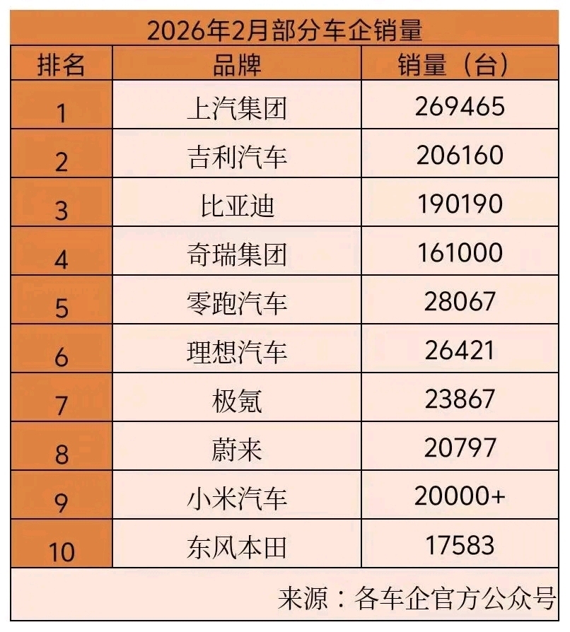 国内车企2月销量数据。