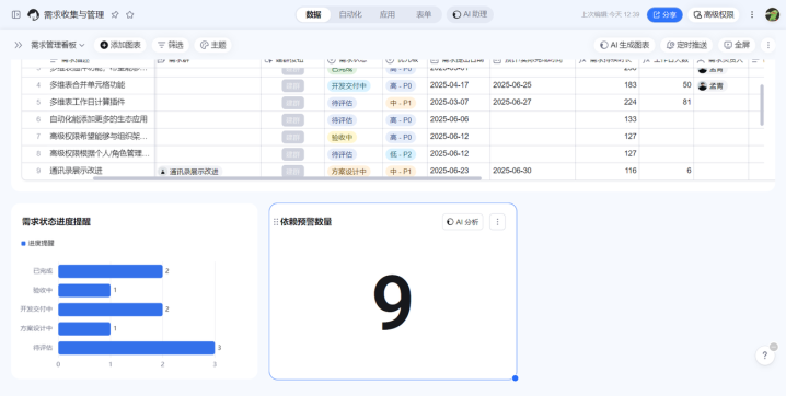现在这一切被彻底重构了。借助AI表格的智能字段与自动化流程,多源需求能自动抓取整合,还会按“功能稳定性”“界面体验”等维度自动打标签分类;进度更新不再需要人工同步,只要研发修改任务状态,需求池就会实时联动,系统还会主动推送提醒,彻底告别“追进度”的内耗。