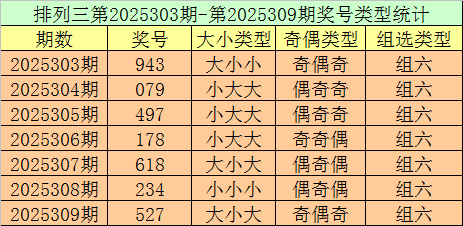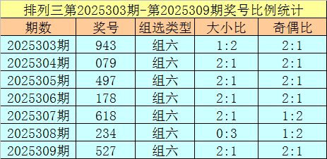 排列三第2025309期回顾:奖号527,奇偶比2:1,大小比2:1,和值14,类型:组六。